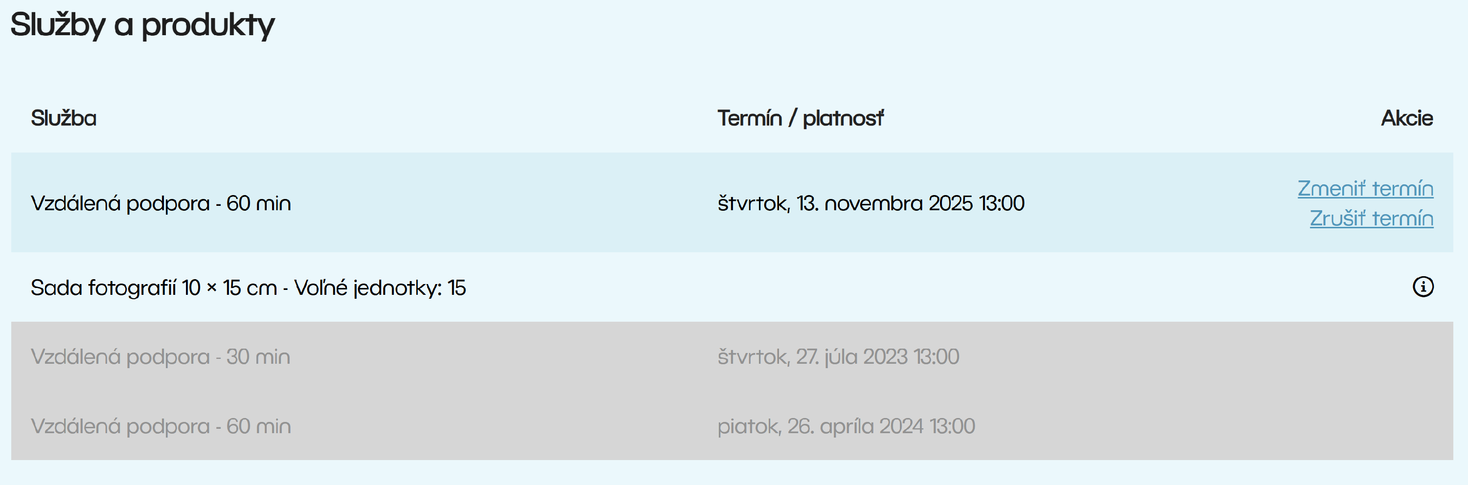 Po zakúpení Vzdialenej podpory sa v Zoner účte v sekcii Služby a produkty zobrazuje prehľad zakúpených relácií, uplatnených aj (ne)naplánovaných.